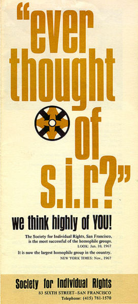 S.I.R. stood for Society for Individual Rights and it was – get ready – homosexual. This was before the birth of LGBT and similar initials; “homosexual” meant men who liked men.