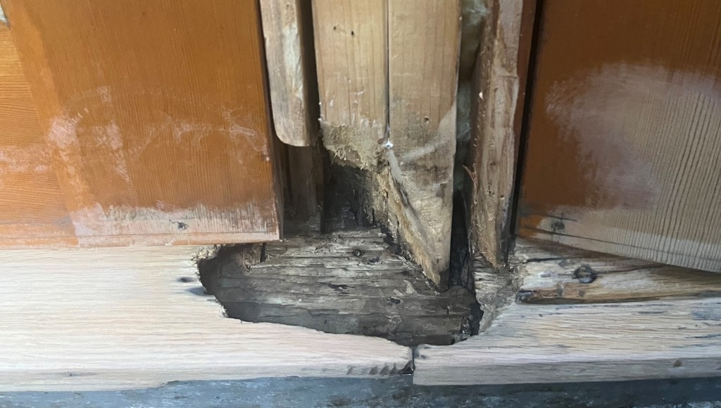 shows detail of the damage to the door